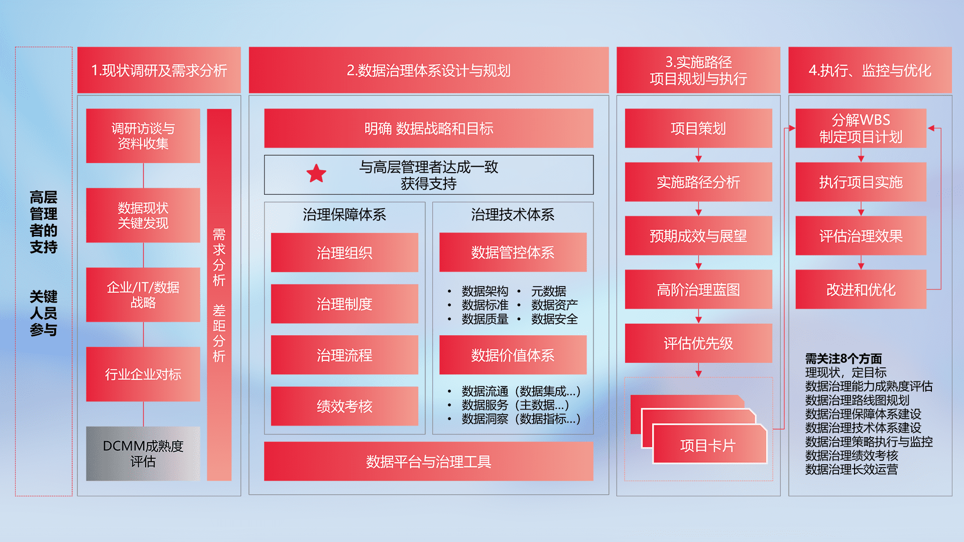 制定并执行统一的数据标准,,,规范数据定义和格式,,,,消除冗余和不一致性,,,实现跨部门和跨系统的数据一致性,,,,为企业提供标准化的数据基础。。。。